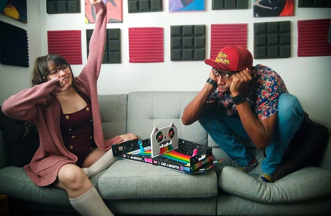 Slingshot balls through a cat's mouth in this hilarious, travel-friendly game where the box is the board.