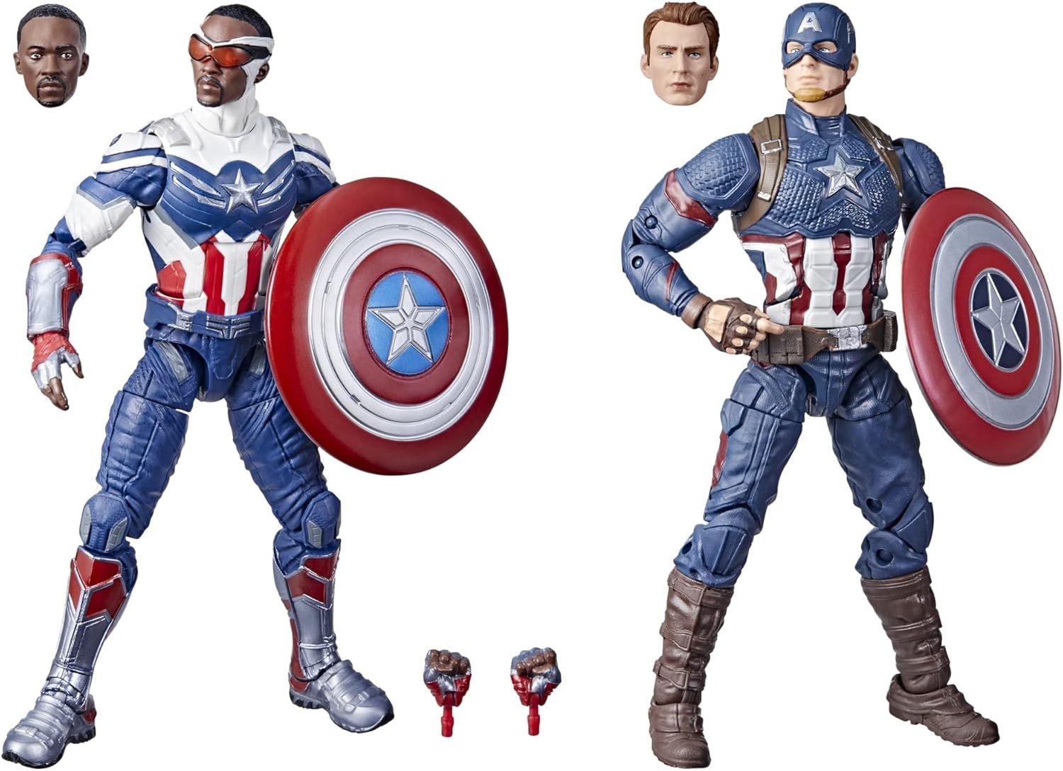 Shaken by the events of Infinity War, Steve Rogers takes up the shield and mantle of Captain America once more to face Thanos. Wielding the shield and new wings from Wakanda, Sam Wilson takes up the mantle of Captain America to bring hope to an uncertain world. With over 80 years of entertainment history, Marvel has become a cornerstone of fan collections around the world. With the Marvel Legends Series, fan favorite Marvel Comic Universe and Marvel Cinematic Universe characters are designed with premium detail and articulation for posing and display in collections. From figures to vehicles to premium roleplay items, the Marvel Legends Series offers elite character-inspired product for Marvel fans and collectors. Additional figures each sold separately. Subject to availability. Copyright 2021 MARVEL. Hasbro and all related terms are trademarks of Hasbro. 6-INCH SCALE COLLECTIBLE MCU 2-PACK: Fans, collectors, and kids alike can enjoy this 2-Pack of 6-inch scale Captain America figures, inspired by the Marvel Cinematic Universe! •INSPIRED BY THE MARVEL CINEMATIC UNIVERSE: These Captain America 2-Pack figures feature premium MCU-inspired design, detail, and articulation for posing and display in your Marvel collection •SENTINELS OF LIBERTY: This Captain America 2-Pack features Steve Rogers from Marvel Studios’ Avengers Endgame, and Sam Wilson from Marvel Studios’ Falcon & the Winter Soldier on Disney+! •PREMIUM ACCESSORIES: This Marvel Legends Series Captain America 2-Pack figures feature multiple MCU-inspired accessories, including shields, alternate heads, and fists! •MARVEL UNIVERSE IN 6-INCH SCALE: Look for other Marvel Legends action figures inspired by the Marvel Cinematic Universe, including the Winter Soldier, Vision, and Scarlet Witch! (Additional figures each sold separately. Subject to availability.)