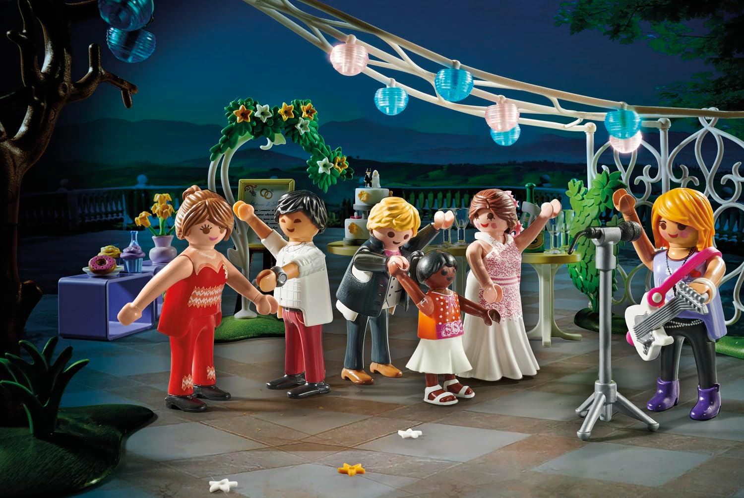 The PLAYMOBIL Promo Pack Wedding Party offers romantic fun for girls and boys aged 4 years and up. The toy set includes seven PLAYMOBIL figures, a dog, two doves, two squirrels, four chairs, a tree for attaching the garlands and many other charming wedding accessories. The garlands with the lanterns can be attached to the tree as well as to the trellis.